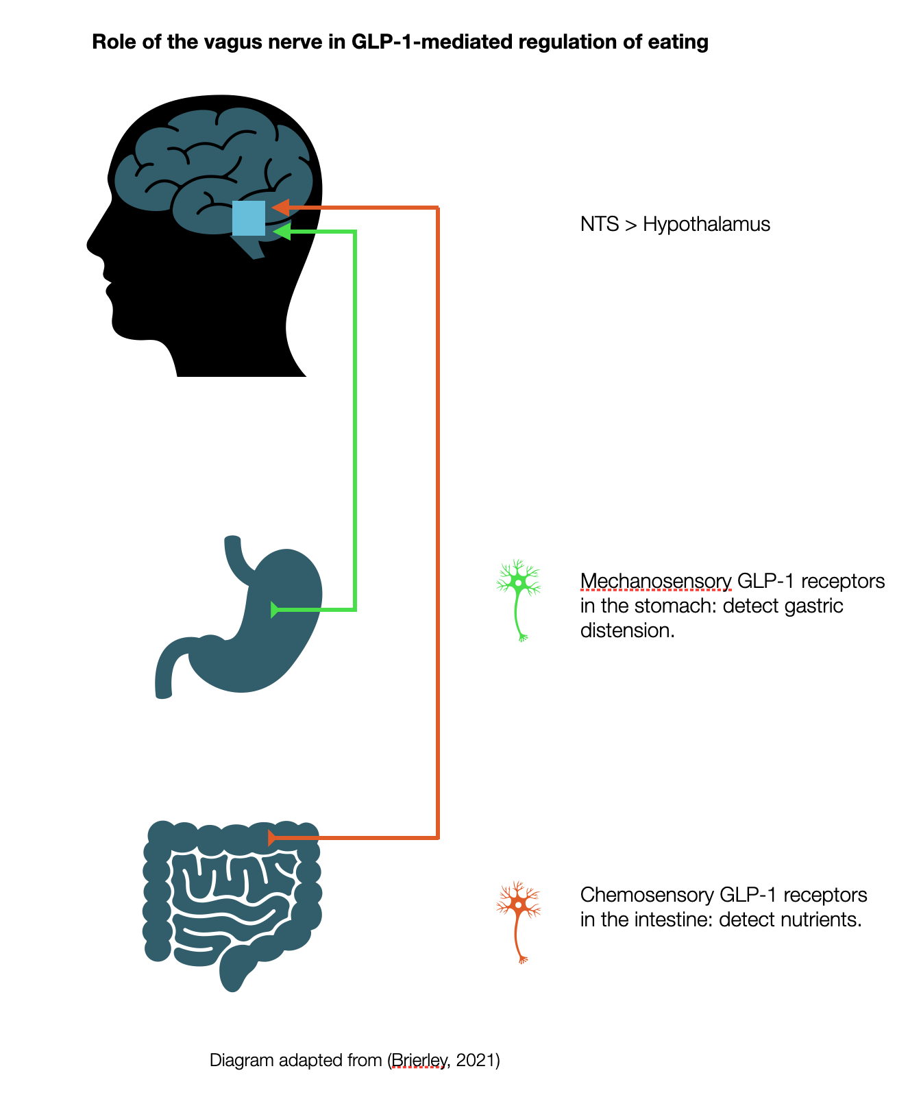 Afferent vagal sensory pathways (to the NTS) and specialized centers in the NTS and hypothalamus are part of the satiety system that sets limits on food intake. According to Haspula (2023), “the DVC, located in the hindbrain, is referred to as the brainstem satiety center. “ The role of the vagus nerve in GLP-1-mediated regulation of eating (Brierley, 2022) describes how glucagon-like peptide 1 (GLP-1), a gastrointestinal hormone and centrally produced neuromodulator, has received particular attention as a gut-brain signaling molecule.
