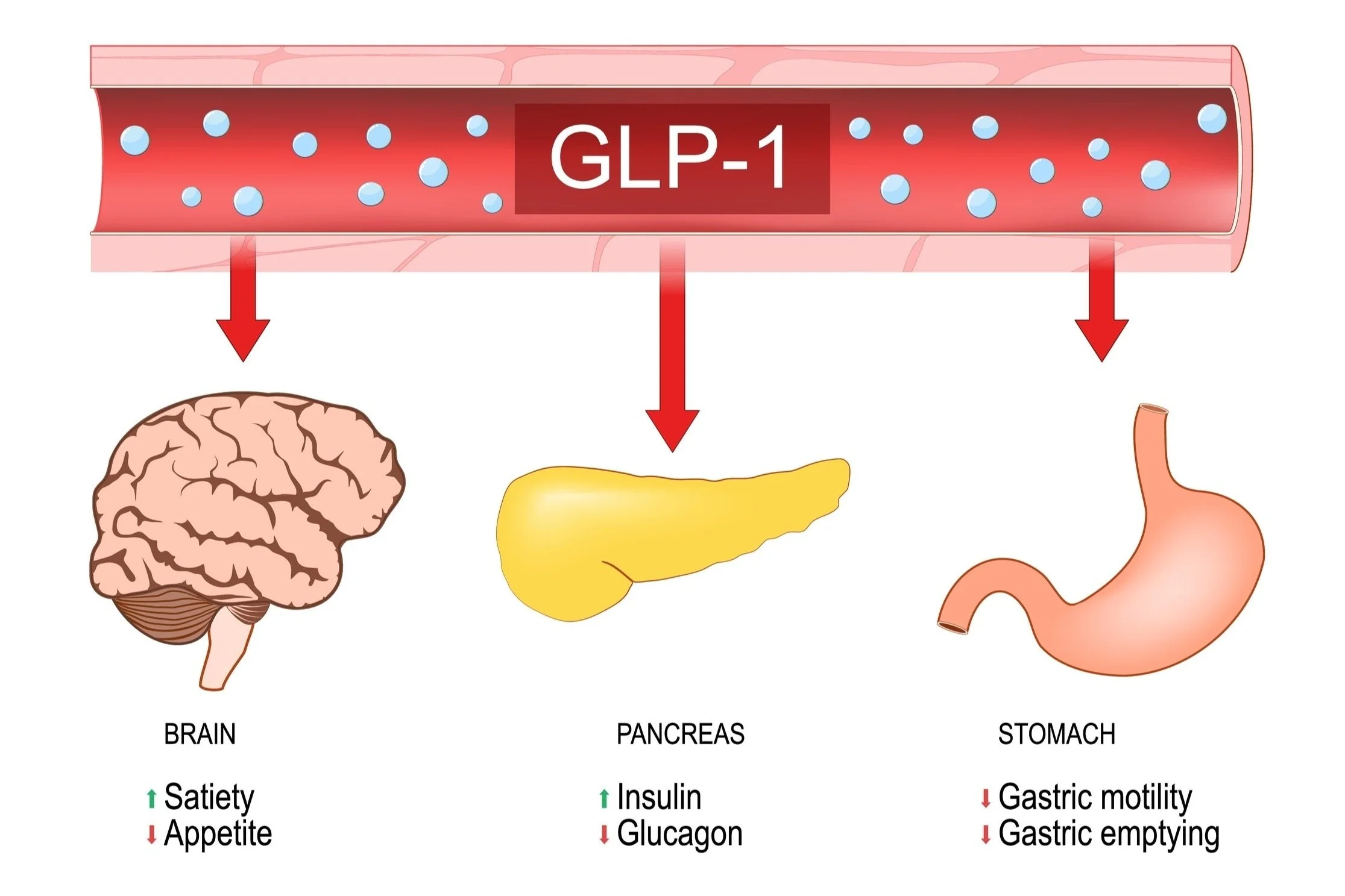 In addition to its effect on blood sugar, GLP-1 affects weight through two mechanisms:
