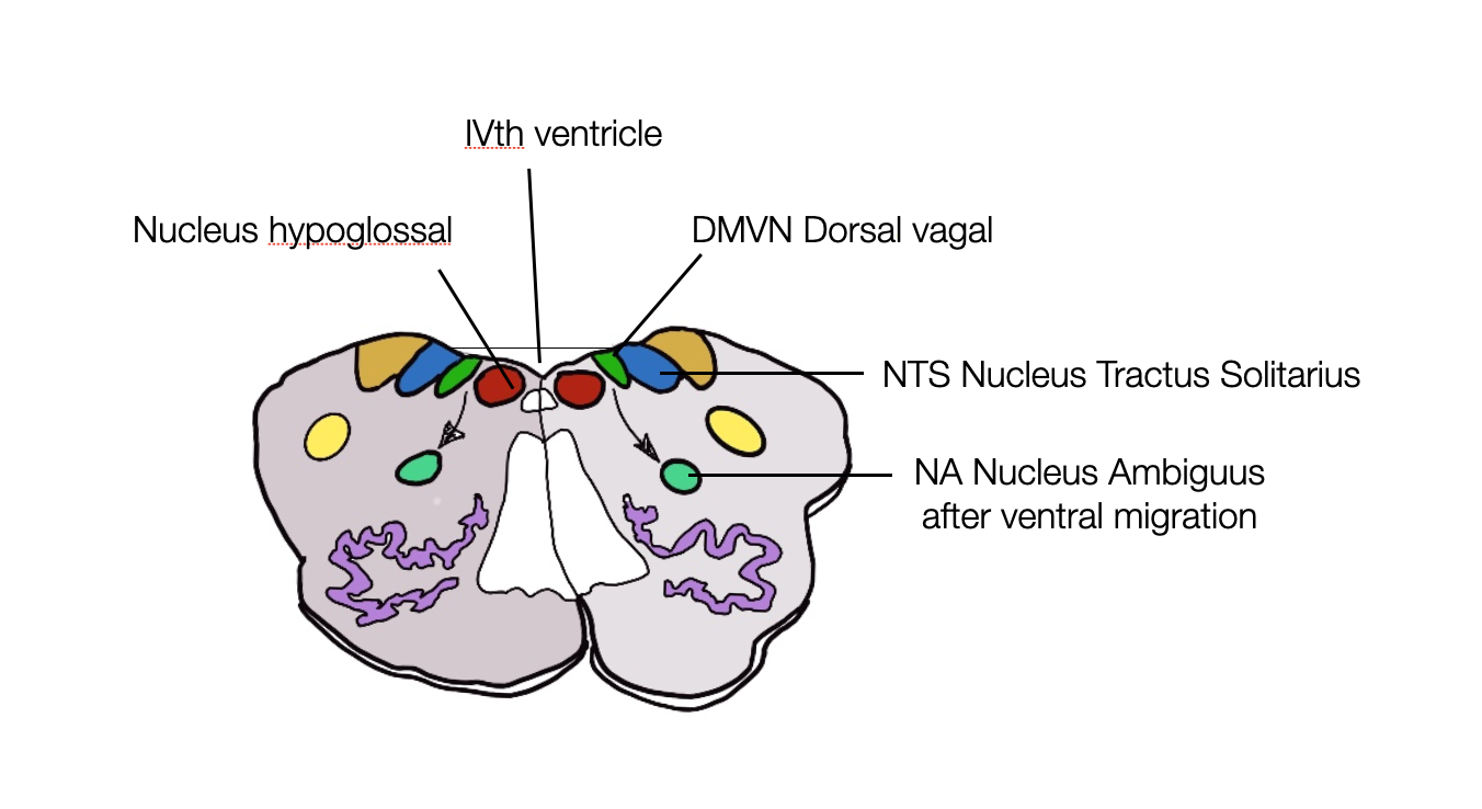 Cross-section of the brain stem: dorsal (NTS, DMVN, CN XII) vs. ventral (NA) nuclei @absb, 2024).