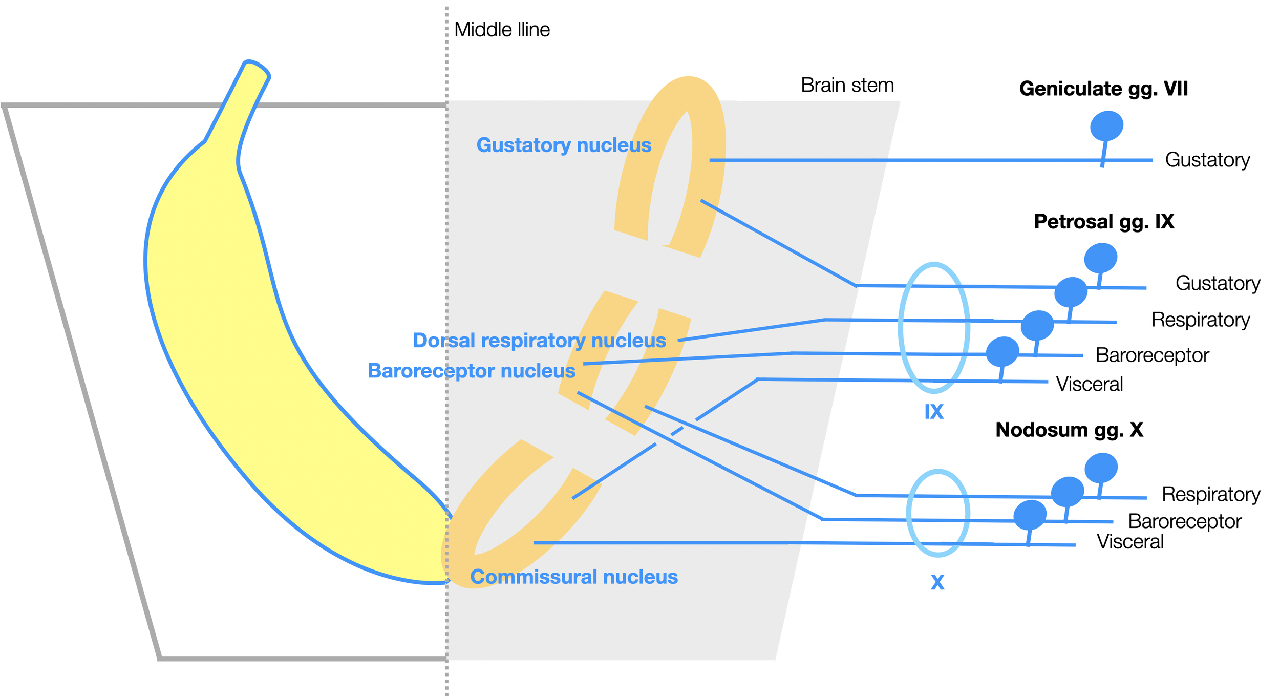 All afferent nerves to the NTS that we see here keep their cell bodies outside the brain in three ganglia (Geniculate, Petrosal, and Nodosum).