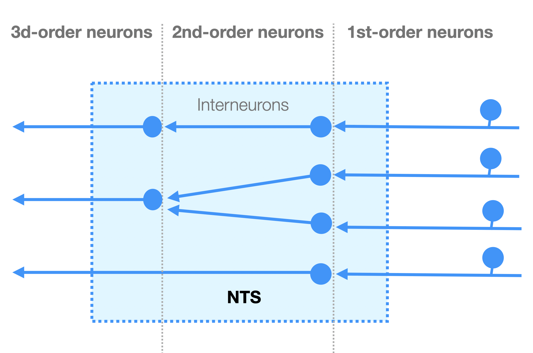Similarly, we find three levels of neurons between the periphery, the NTS (integration), and the efferent parasympathetic nerves.