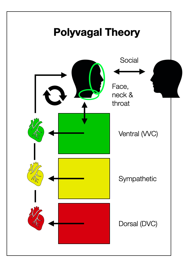The PVT describes three groups separated by history (phylogeny and ontogeny), anatomy, and physiology. The “smart vagal” or ventral vagal complex (VVC) is part of a self-regulatory loop that includes:
