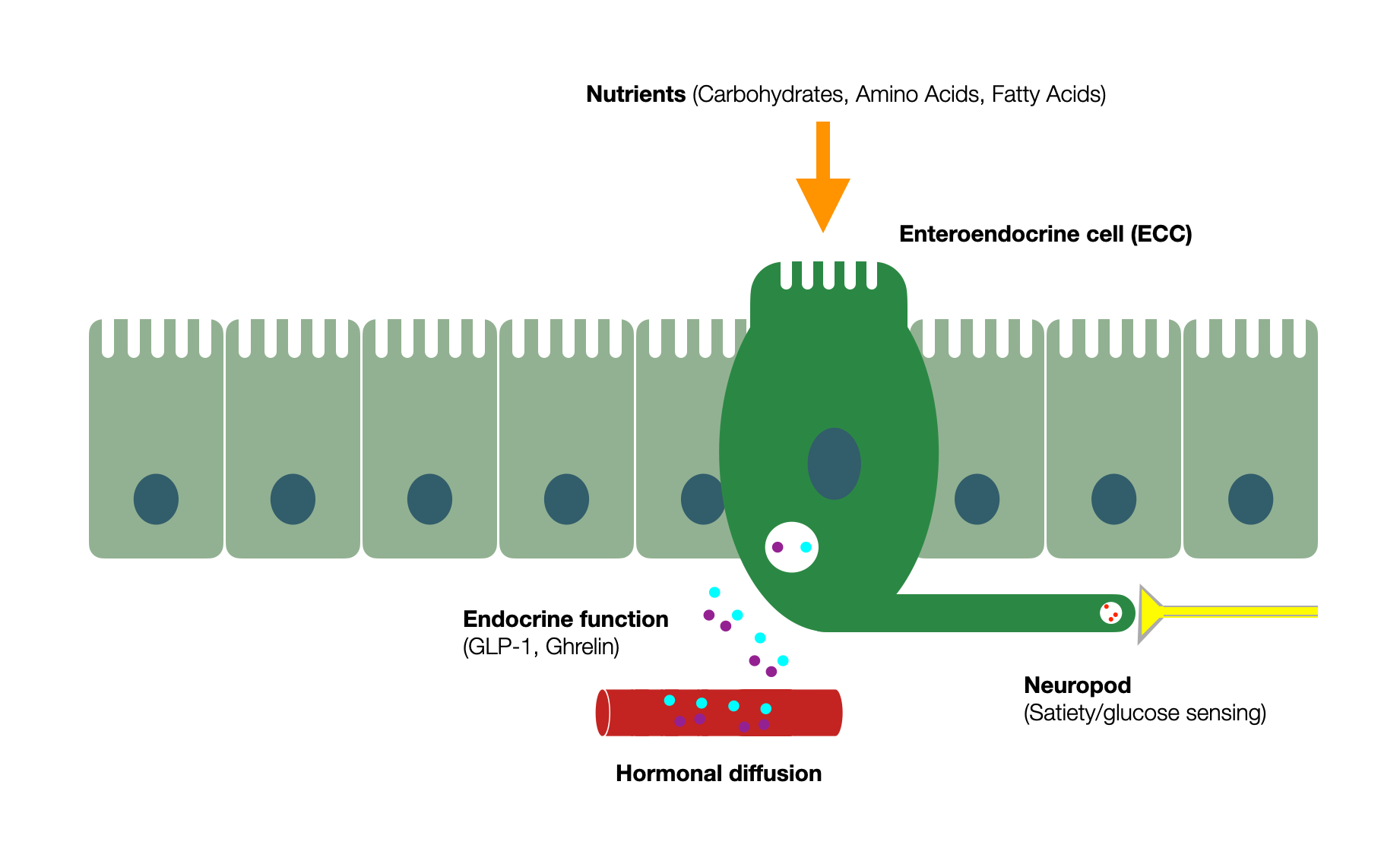 Diagram adapted from Enteroendocrine cell regulation of the gut-brain axis (Barton, 2023)(@absb, 2024).