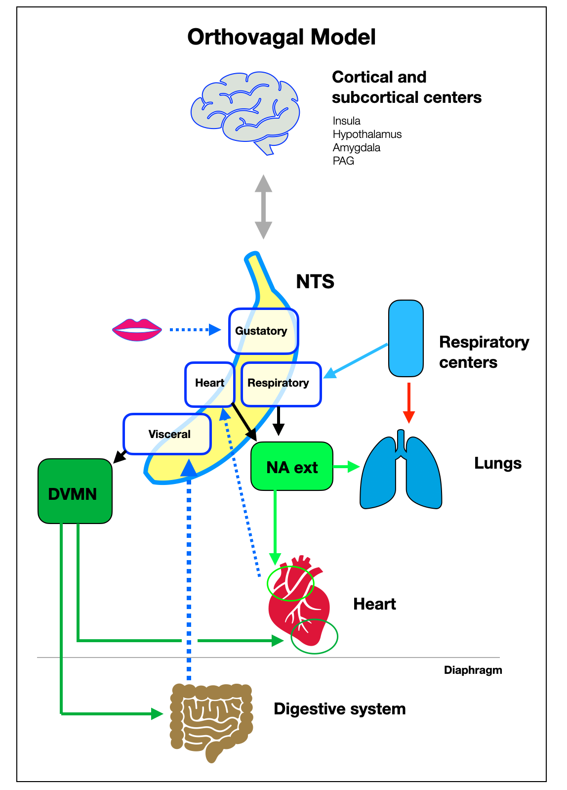 The respiratory centers and the digestive system are not shown on this diagram because they do not play a major role in the polyvagal world. This “vagal loop” doesn't include the NTS, the most important visceral hub in the brainstem. How does the respiratory and baroreceptor information get to the NAext if not through the NTS, which is a part of the “dorsal”? There is a cognitive dissonance here.