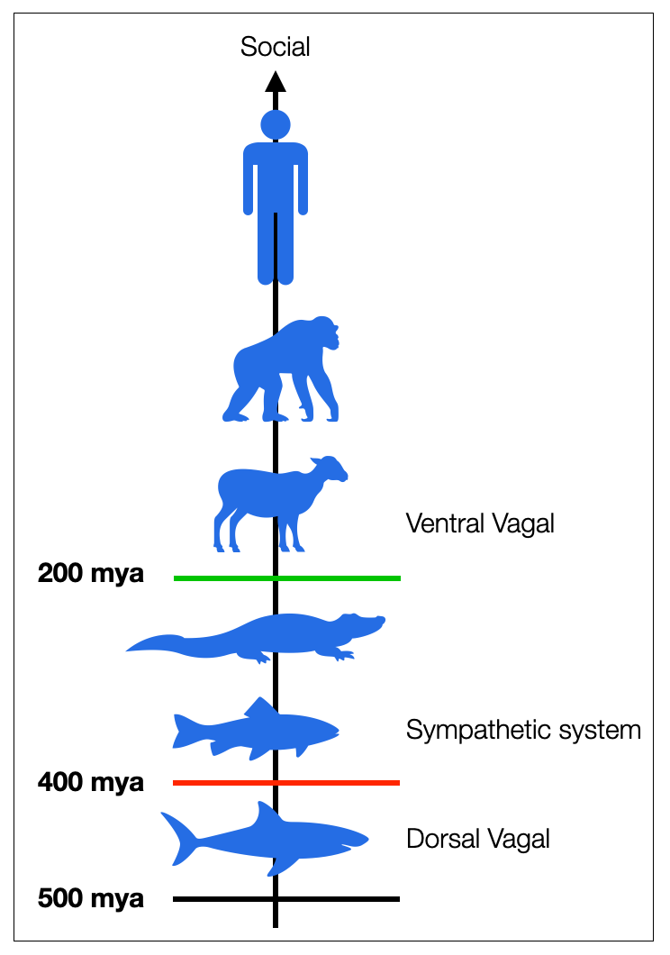 The polyvagal model always has in mind a multi-hierarchical dimension (physiological, psychological, phylogenetic, and ontogenetic), dating the three systems (dorsal, sympathetic, and ventral) according to when they supposedly “punched the evolutionary clock.”
