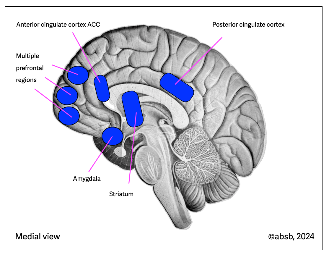 In rare interviews, Porges admits that a form of immobility — quiescent immobility — can be experienced without fear. See Love’s Brain: A Conversation with Stephen Porges (Loizzo, 2018). Porges paints a fascinating portrait of the dorsal vagus in this interview — another illusion. The silence of the mind certainly doesn't originate in a visceral complex designed to modulate appetite, digestion, the immune system, and cardio-protection, to name the most basic functions. We must look higher in the brain to the general cortical networks. Meditation practices reducesactivity in the DMN (default mode network), resulting in less mind-wandering and an increased sense of presence.
