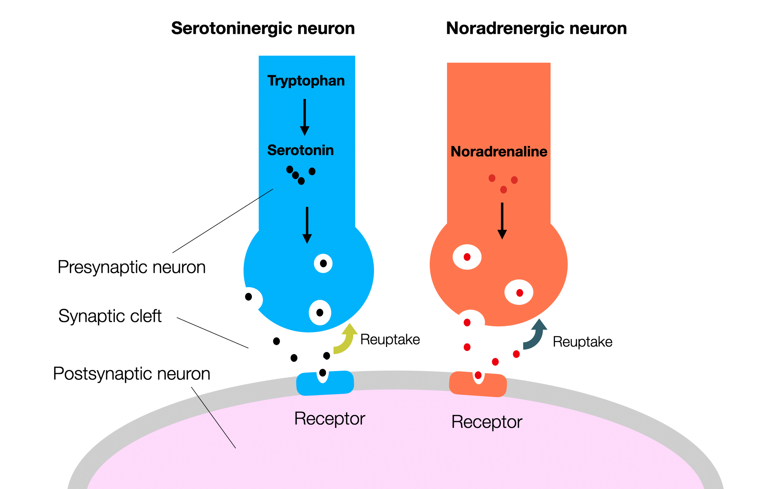 Antidepressants block the reuptake of neurotransmitters (serotonin and norepinephrine), thereby increasing the ongoing activity of the synapse. They also support the formation of receptors on the second neuron (neuroplasticity).