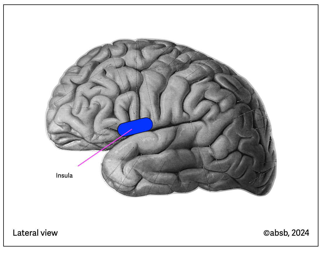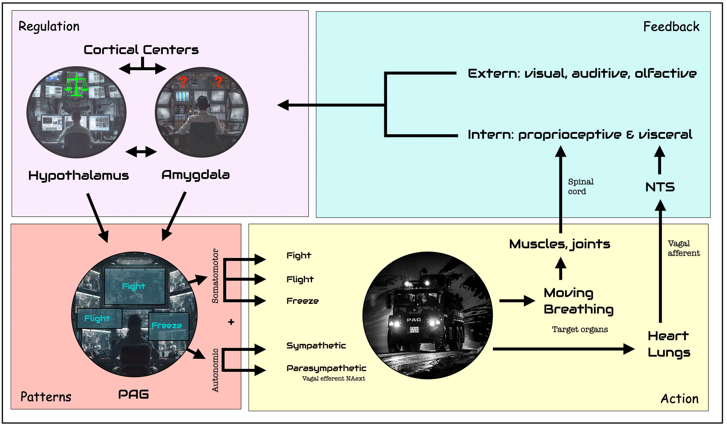 Action loop. In this schematic, we see the circuit of response to a critical incident, starting at a cortical or subcortical level, orchestrated by the PAG, and executed by the somatomotor and autonomic systems. A feedback loop runs up through the spinal cord and the sensory vagal nerve, parallel to the external perceptual pathway. The PAG is the operations center that immediately sends a SWAT team (truck) into action. It can react quickly thanks to predefined fight, flight or freeze patterns. The amygdala is specialized in detecting novelty (positive or negative) and threat levels. The hypothalamus' main goal is to maintain balance, but it is sometimes the source of aggressive behavior. Higher centers perform cognitive tasks, such as assessing the reality of the threat (e.g., ACC) or developing strategies for action (prefrontal cortex): ©drmuret, 2024.