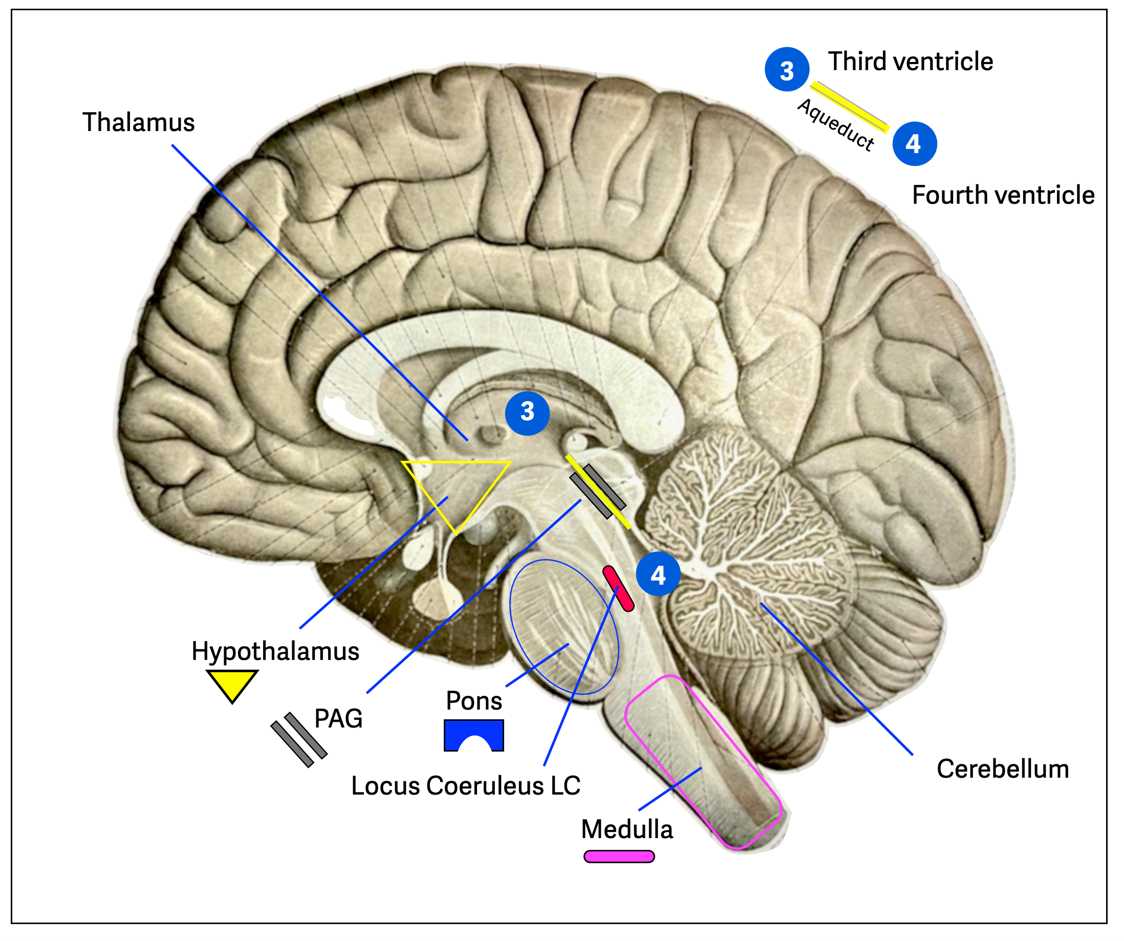 These schematic diagrams show the location of the PAG. The first illustration-reminiscent of Mickey Mouse-illustrates the circulation of cerebrospinal fluid from the first two ventricles to the third ventricle. It then travels through the upper midbrain to the fourth ventricle and then down to the spinal canal.