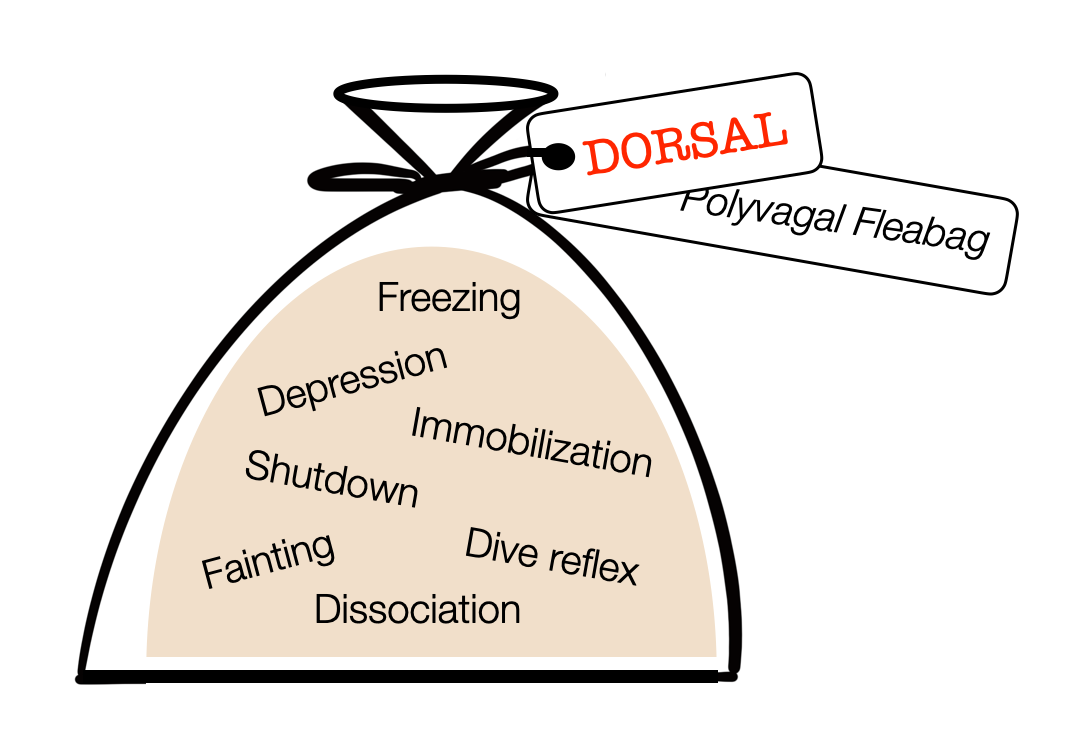 Labeling these reactions as “dorsal” is a powerful attribution fallacy. Immobilization and freezing are motor patterns commanded by the PAG (midbrain). The sympathetic system shuts down the digestive process. Fainting reaction results from a sudden decrease in sympathetic tone or a ventral vagal response. Dissociation refers to higher (cortical) regions. The diving reflex combines vagal (NAext) and sympathetic activity. The DVMN doesn't participate in any of the responses packaged in the “polyvagal fleabag.”