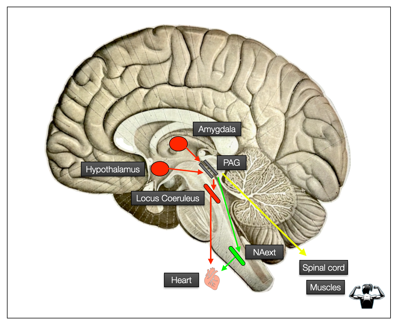 This next schematic (brain shape based on Sobotta, 1922) illustrates some parts of the chain of command from the hypothalamus or amygdala to the PAG and then down to the heart (autonomic pathway) or muscles (somatomotor pathway).