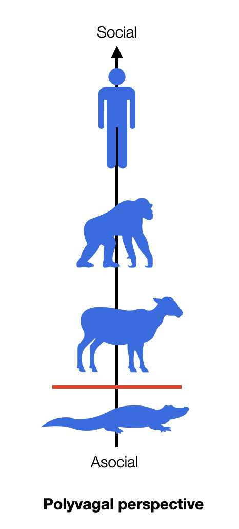 In Polyvagal Theory: A biobehavioral journey to sociality (2021), Porges postulates that “evolution has repurposed the neural regulation of the autonomic nervous system to support sociality”. For him, there is evidence that the vagal system in mammals “has been repurposed to support and express sociality” (Porges et al., 2021). This concept, rejected by Grossman (2023), is scientifically incorrect in two ways. First, evolutionary theory doesn't welcome teleological claims. Even if domesticated mammals are somehow more social than “reptiles,” there is no original blueprint. Second, as we will see in the chapter “Social,” Many non-mammals, including invertebrates, lead highly social lives.