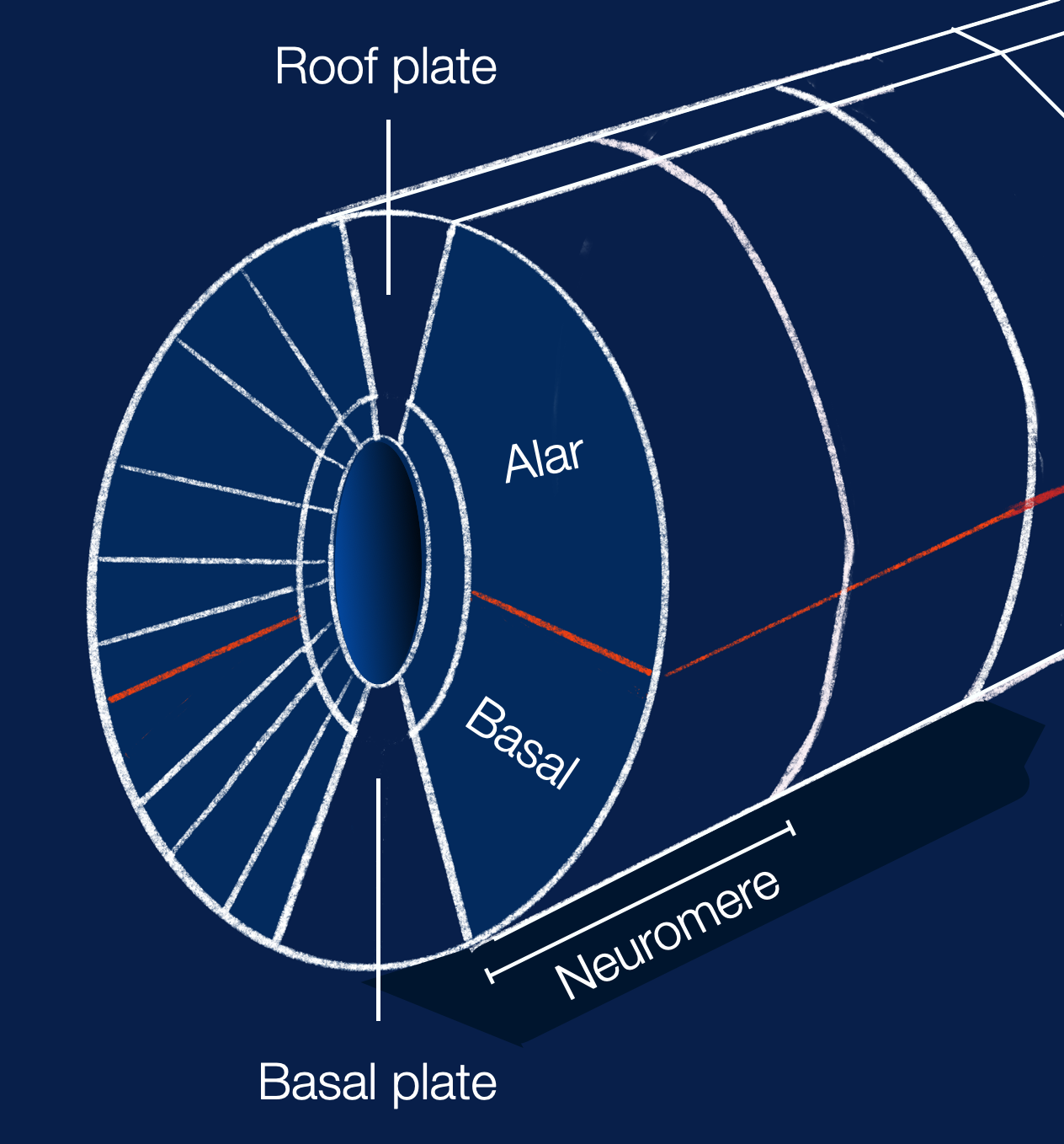 This diagram shows the different domains within a neuromere (cross-section of an early vertebrate embryo). The red line shows the boundary between the sensory (alar) and motor (basal) domains. The neural tube's development follows a strict distribution of neurons within plates (radial) and neuromeres (longitudinal), which is part of the universal vertebral blueprint. (illustration based on Nieuwenhuis, 2016, adapted ©absb, 2024).