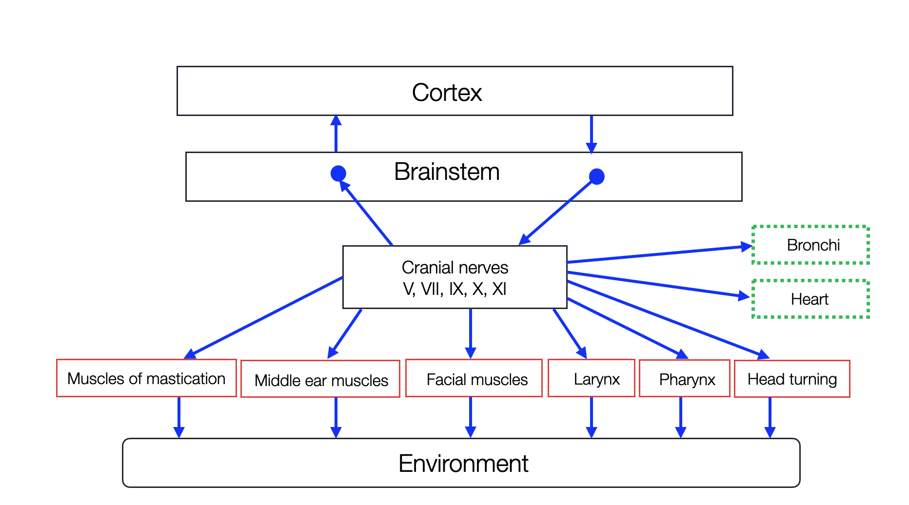 While Porges' argument makes sense, there are numerous caveats. The migration of cardiac vagal neurons CVN is often incomplete in many mammalian species, with some CVN remaining in the intermediate zone between the dorsal and ventral positions. Because the non-myelinated “dorsal” motor C-fibers have been identified primarily in small animals (cats and mice), researchers working with larger animals (e.g., sheep) have identified fibers with velocities comparable to B-fibers. This leads them to suspect the presence of myelinated dorsal motor fibers (Booth, 2021). Indeed, myelin and size are positively correlated — as we see with myelinated axons in an octopus (Boullerne, 2016), (Zalc, 2008). Porges, who rarely refrains from logical fallacies, accuses Taylor and Grossman of using a “straw man argument”: this is amusing. He is not wrong per se, but these skirmishes over “to be or not to be myelinated” are a smokescreen that hides more serious reservations about PVT. Obsessed with his social engagement argument, Porges doesn't see that the branchiomotor — or pharyngeal apparatus — was primarily developed and maintained for one crucial purpose: food! Secondarily, in terrestrial species, the laryngeal portion is related to respiration and vocalization, two highly interrelated functions.
