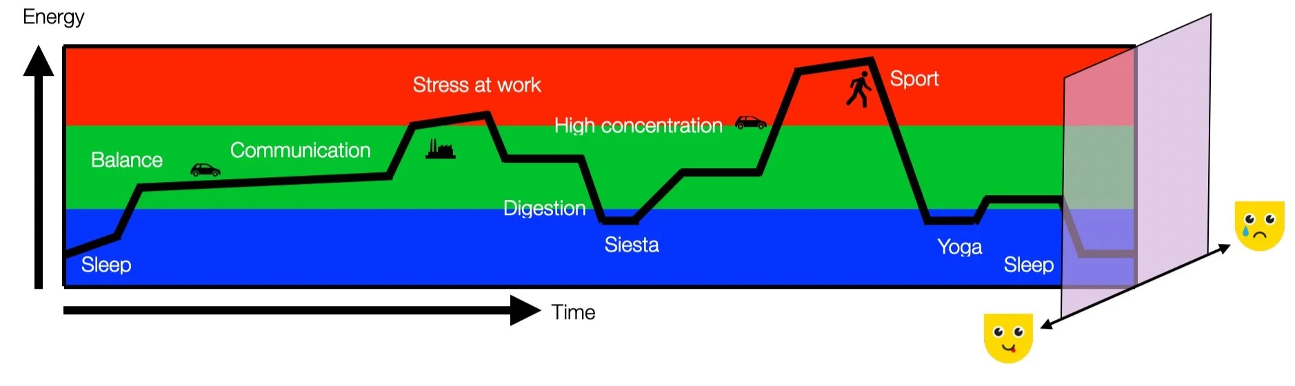 Instead, we propose a 3D model that integrates the three physiological domains from a non-pathological and non-hierarchical perspective. In a later chapter, we will present a more detailed diagram representing a typical day with three physiological energy domains. Energy and time are the first two coordinates (X and Y). The positive (pleasant) and negative (unpleasant) values are represented by the depth (Z). More about this topic under “What else?”