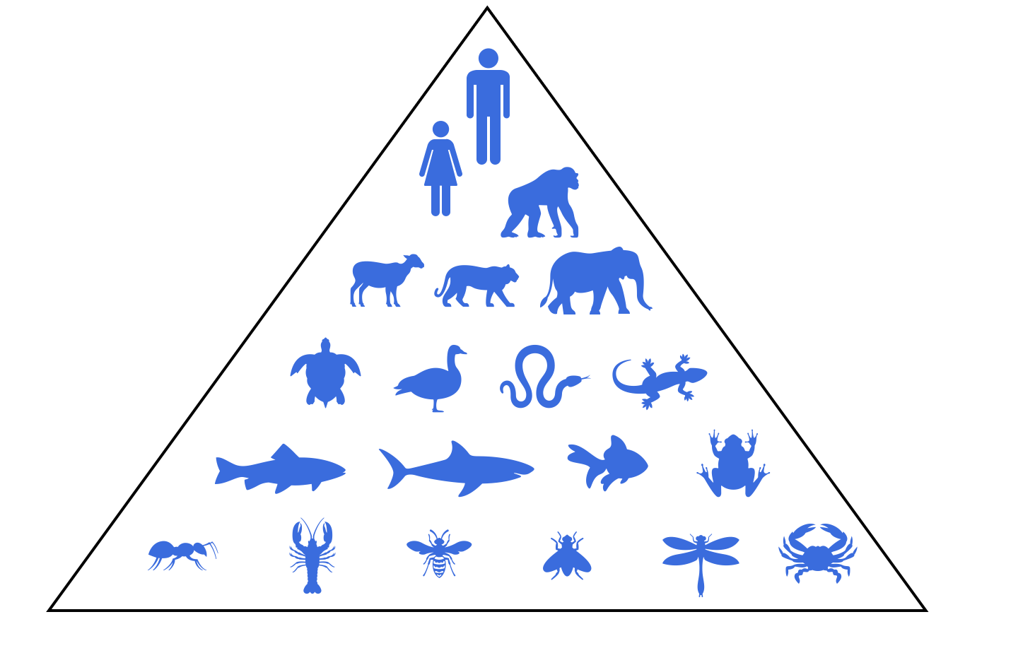 This diagram shows the hierarchical model of the Scala Naturae as proposed by Aristotle and later adopted by the monotheistic religions. It sees creation as a monophyletic ascent from the simple to the complex. Darwin, however, had a polyphyletic vision. Modern evolutionary biology, especially the cladistic perspective, has vindicated him, for evolution shows how multiple living things successively evolve (mutations) and select (natural selection) new traits to adapt to their ecological niches. These processes often occur in parallel, as convergent evolution, in separate, unrelated clades. Wings in birds and bats or endothermy in birds and mammals are some examples. A strict unidirectional ladder model makes it difficult to understand how evolutionary acquisitions (e.g., myelination, sociality, language, diving reflex, fur, and migration from sea to land or back to sea) result in separate lineages (clades)(@absb, 2024).