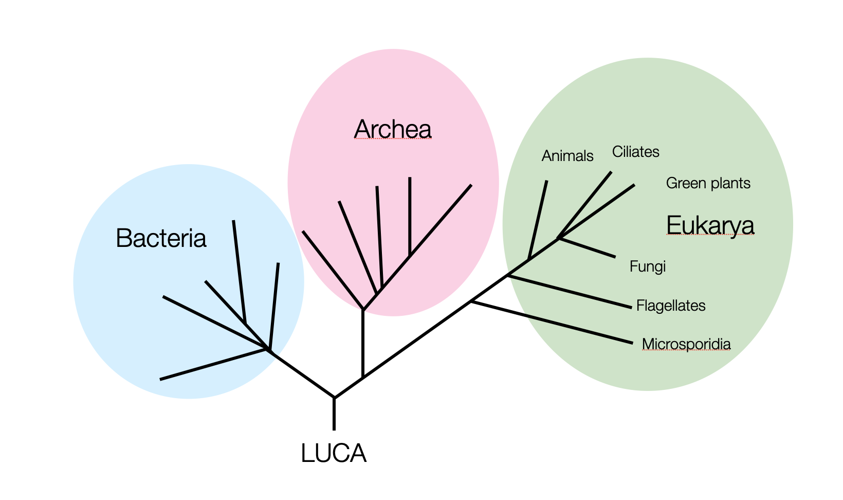 Schematic representation of the three domains of life. Scientists estimate that LUCA (the Last Common Ancestor) was around 3.5 to 3.8 billion years ago (©absb, 2024).