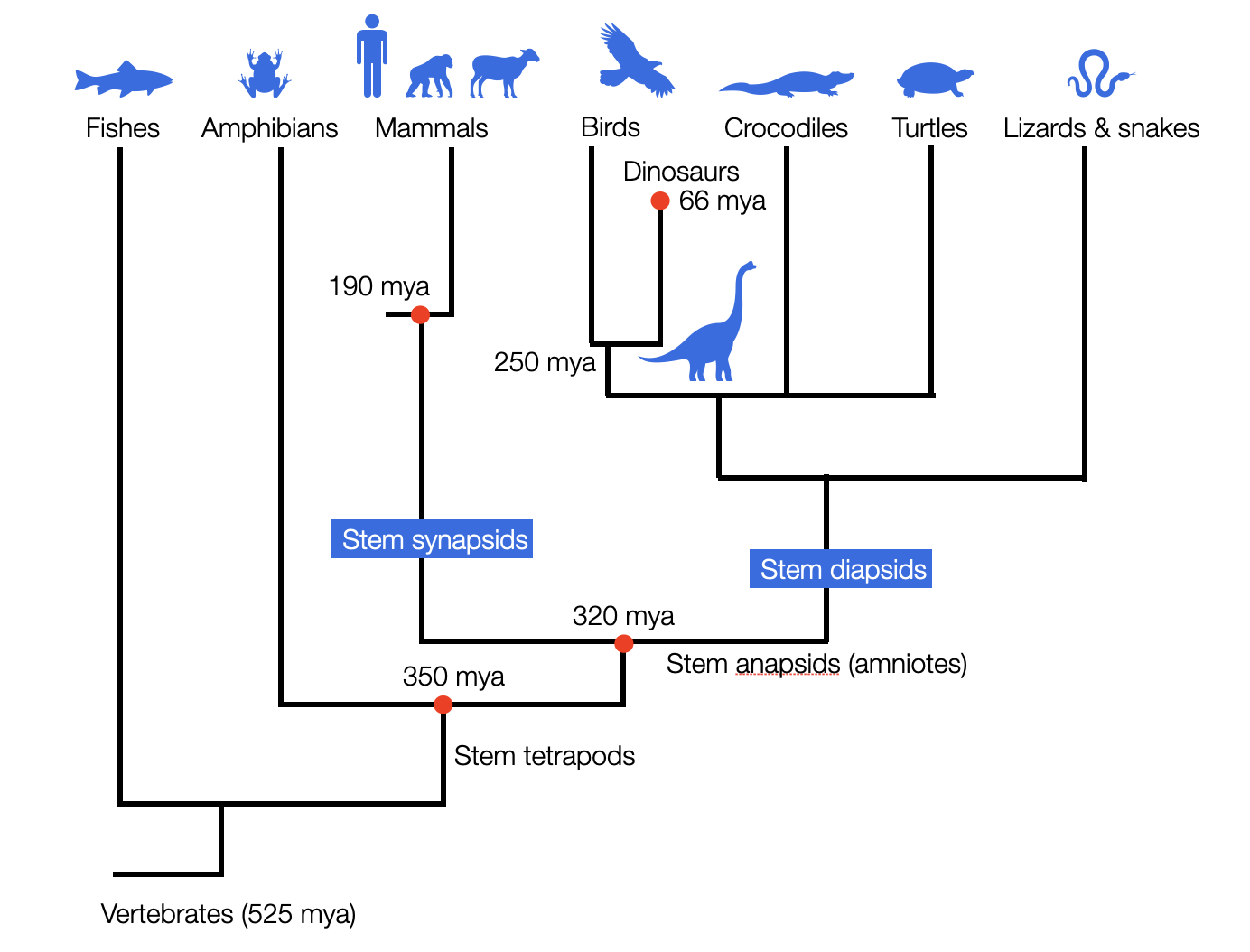 Approximately 350 million years ago, a key evolutionary split occurred among the stem tetrapods (from Greek, meaning 'four feet'). Unlike amphibians (e.g., frogs), which must lay their eggs in water, amniotes lay eggs with hard shells, allowing them to thrive independently of aquatic environments such as rivers, lakes, ponds, and swamps. Stem amniotes are sometimes called 'reptiliomorpha,' though this doesn't classify them as reptiles. For more information, see: Reptiliomorpha. Readers are encouraged to examine the cladograms at Sauropsida that illustrate the early divergence of pathways leading to modern reptiles and mammals.