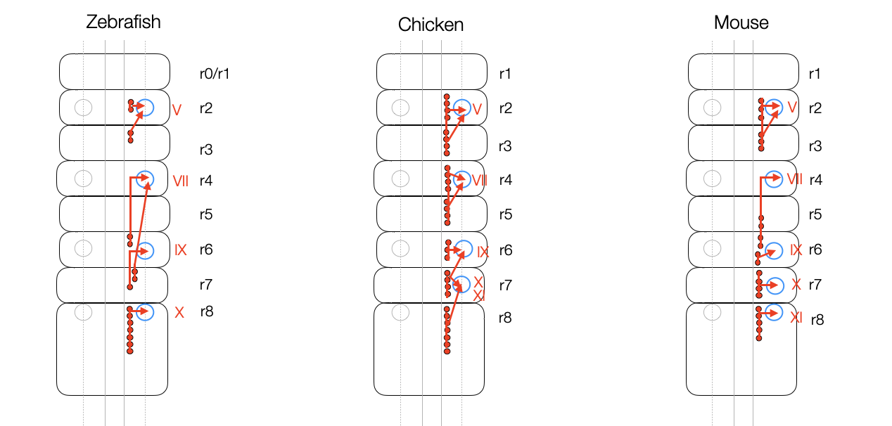 Simplified representation of the branchiomotor neurons in the hindbrain (rhombomeres 0-8), based on Fig. 1 in Chandrasekhar (2004). All vertebrates form homologous cranial nerves (V, VII, IX, X) and muscles allowing basic movements (e.g., capturing, chewing, and swallowing) (adaptation, ©absb, 2024).