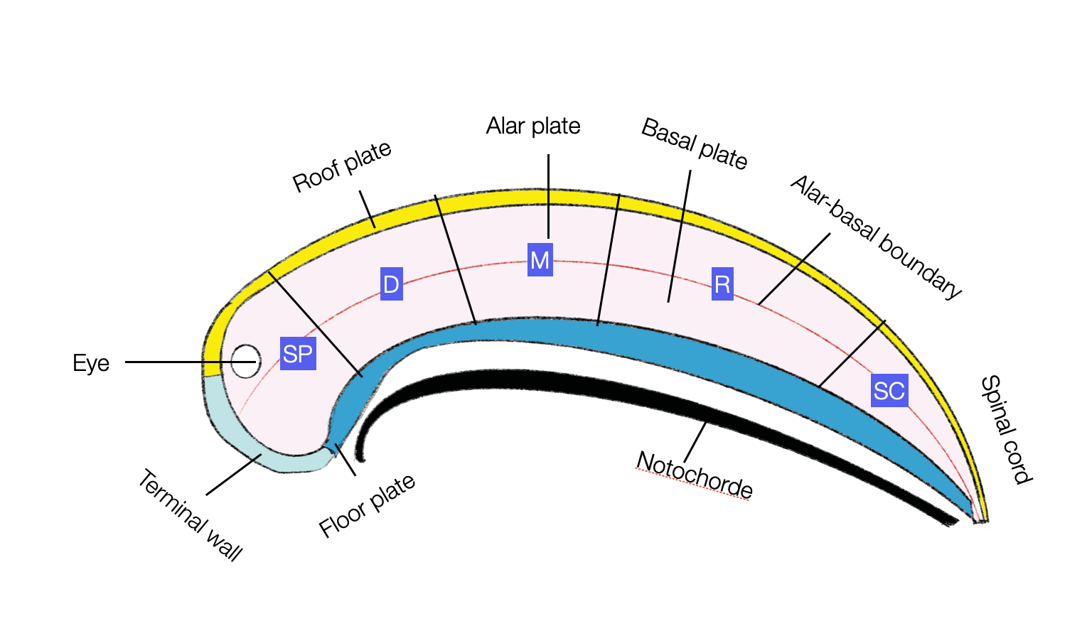 SP = secondary prosencephalon, D = diencephalon proper, M = mesencephalon, R= rhombencephalon, and SC = spinal cord.