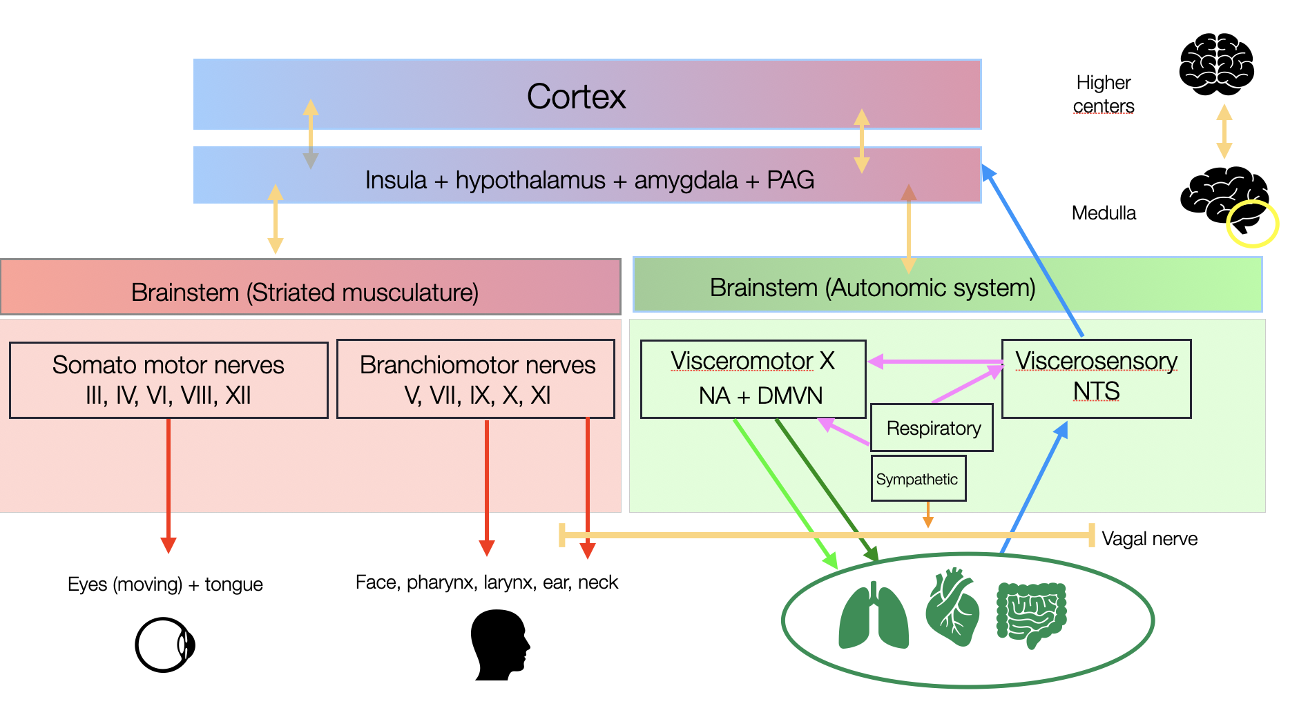 The apparent proximity of the branchiomotor nuclei (V, VII, IX, and X) is misleading. In the literature, we found no evidence of direct local connections between these nuclei. The new diagram highlights the functional disparity: one side representing the somatomotor component (striated muscles), the other, the visceromotor component (modulating cardiorespiratory functions). The nucleus ambiguus (NA) contains both types of nuclei, reminiscent of the divided sovereignty of Cyprus in the Mediterranean. Notably, we found no evidence of direct connections between the four regions of the NA. Conversely, the external formation (NAext), which originates the ventral parasympathetic pathway, is strongly connected to the NTS (nucleus tractus solitarius), the central hub for visceral functions.