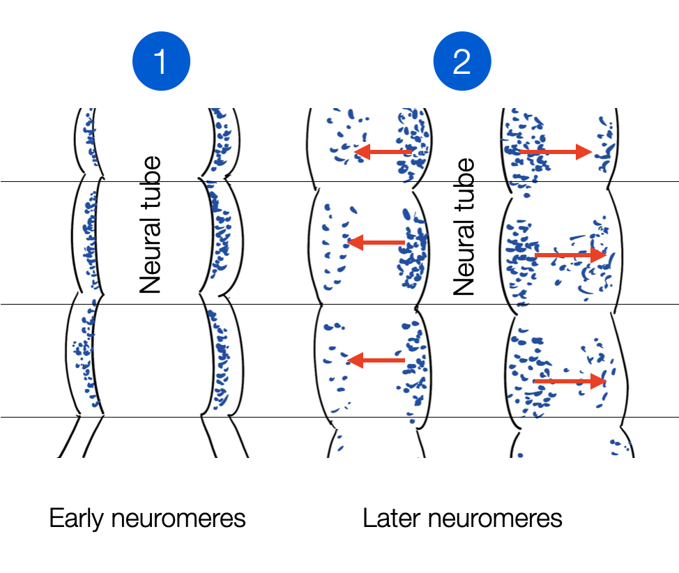 There are two more articles to consider: Establishment of vagal sensorimotor circuits during fetal development in rats (Rinaman, 1993. p. 651) describes how, in rat embryos, the first motor neurons are seen in the NA region at E13 (embryonic day), as well as neurons in the dorsal region that migrate toward the NA. Labeled DVMN motoneurons are first seen at E14. The migration of NA neurons appears to continue after their axons have projected peripherally. NA motoneurons complete their migration between E15 and E16. NA motor axons enter the peripheral gastric field before DMVN motor axons.