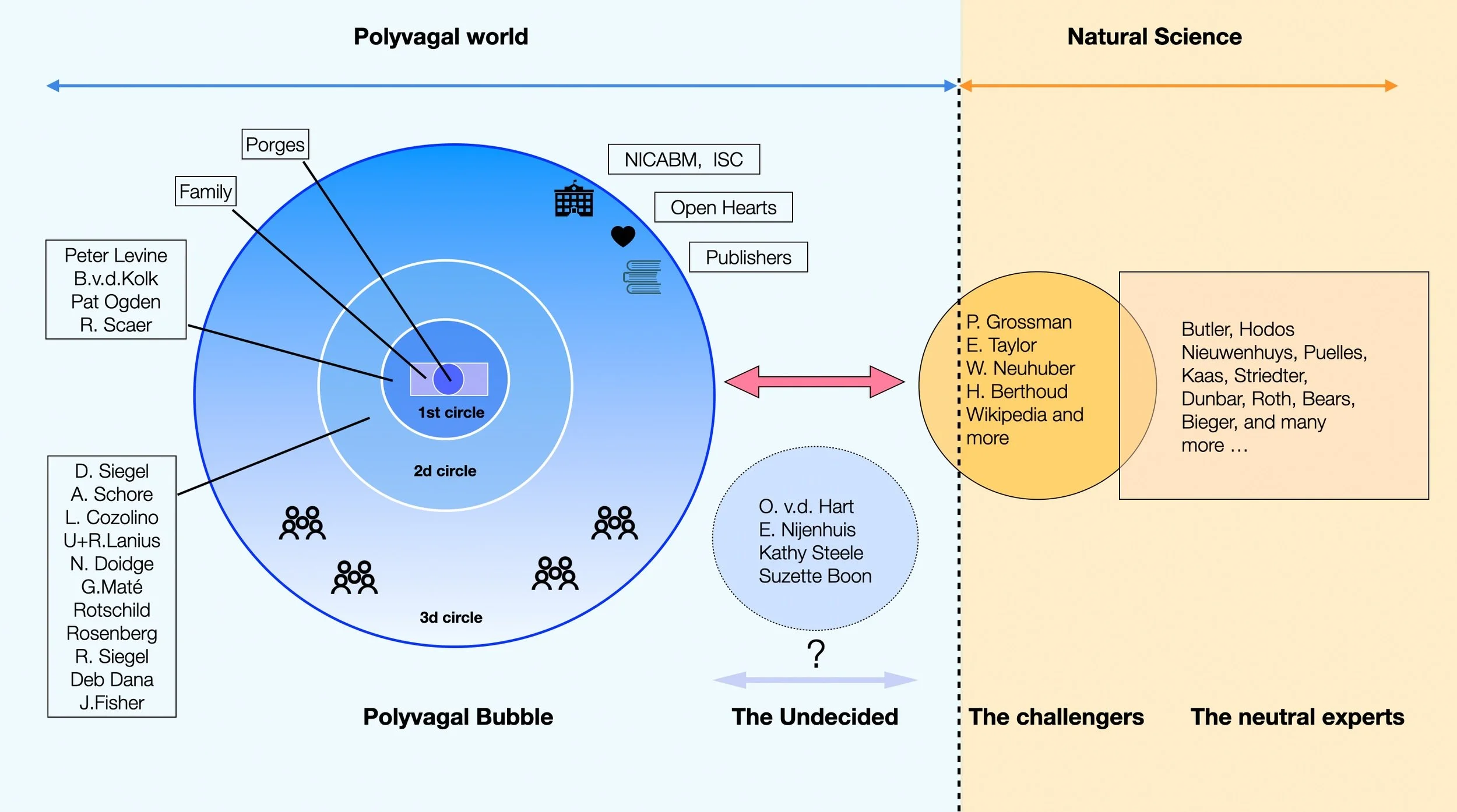 Between the Polyvagal Community and the Natural Science field, an intermediate group of “casual visitors” exists. This includes authors referencing or discussing PVT without fully committing to its claims, such as Onno van der Hart, Ellert Nijenhuis, Kathy Steele, and Suzette Boon. Their stance is ambiguous, as they neither firmly reject nor rigorously support PVT.