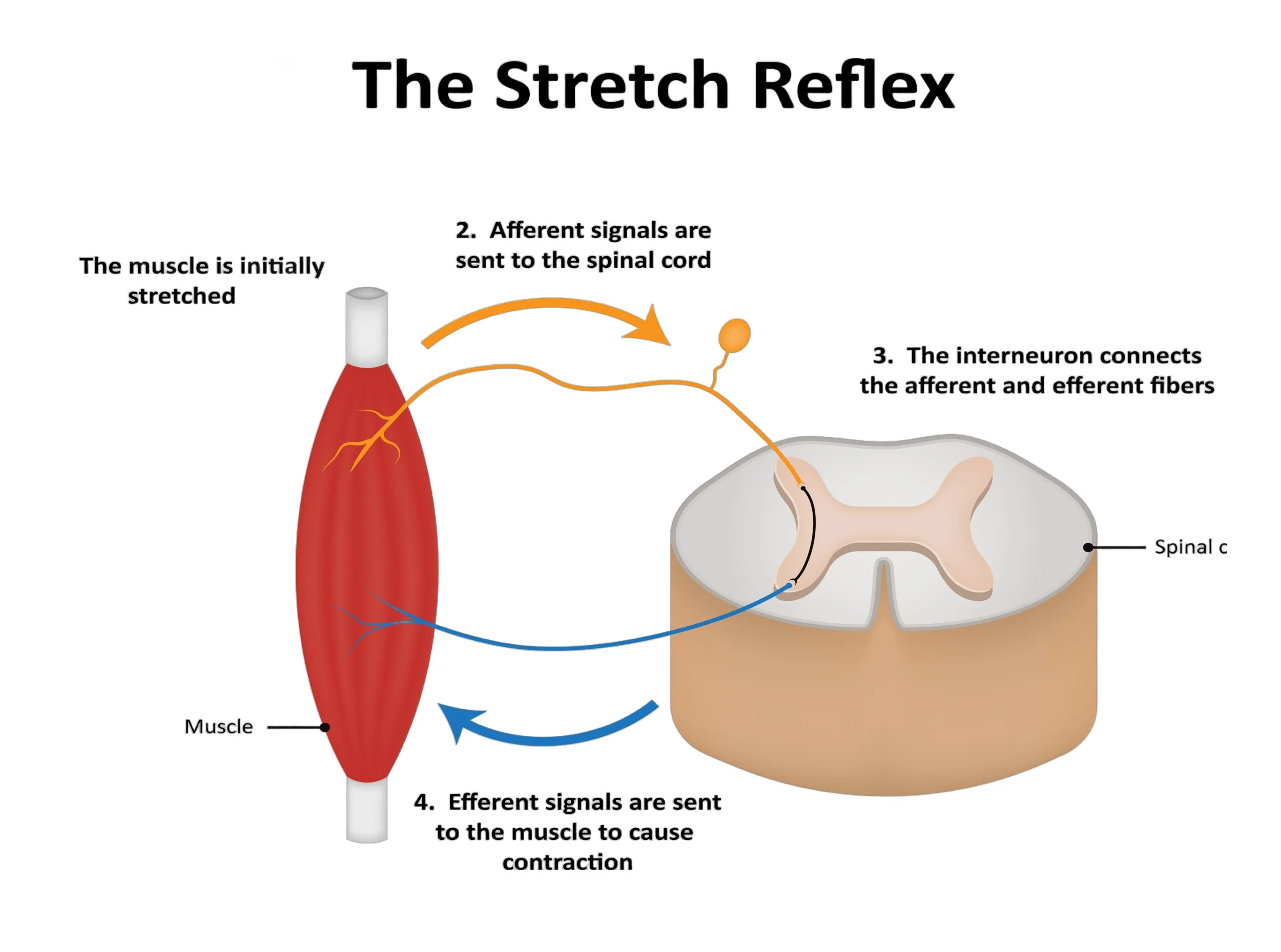 1. Stretch reflex: In the muscles, small muscle fibers with sensors, called muscle spindles, respond to stretching. These send signals to the spinal cord. Through interneurons and efferent motor fibers, a signal is sent to the muscle to cause contraction.