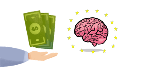 Neuromarketing: A GIF showing a brain surrounded by stars and a hand holding dollars.