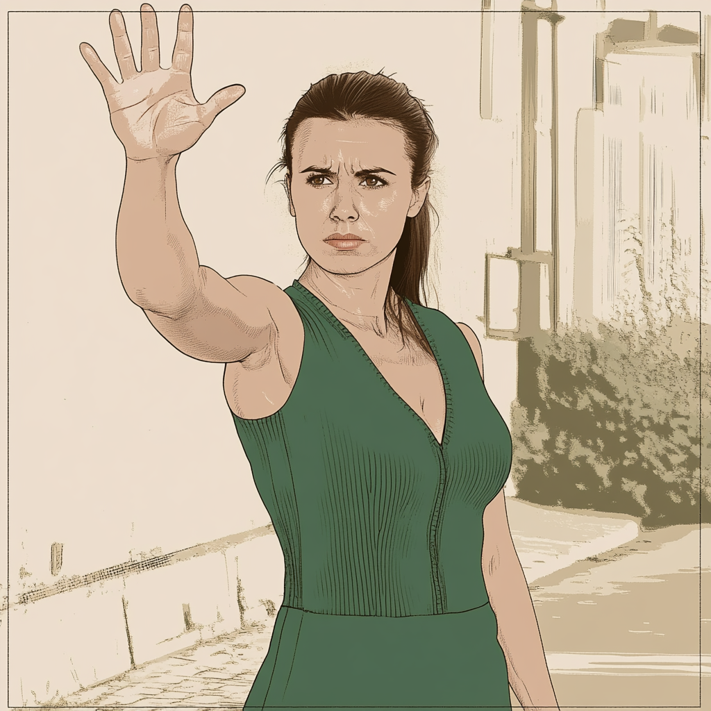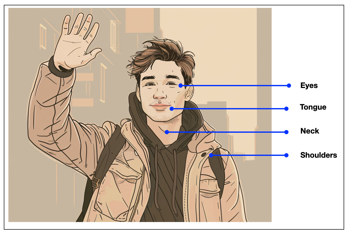 Now consider the next two images of the same young man waving with his right hand. Despite a neutral facial expression (closed mouth, half-open eyes), his gesture conveys a sense of friendliness. Hands, as powerful social signals, can be perceived from a great distance. Whether it's holding hands, caressing, or tapping, these actions are powerful social expressions. Arms can hold and embrace.