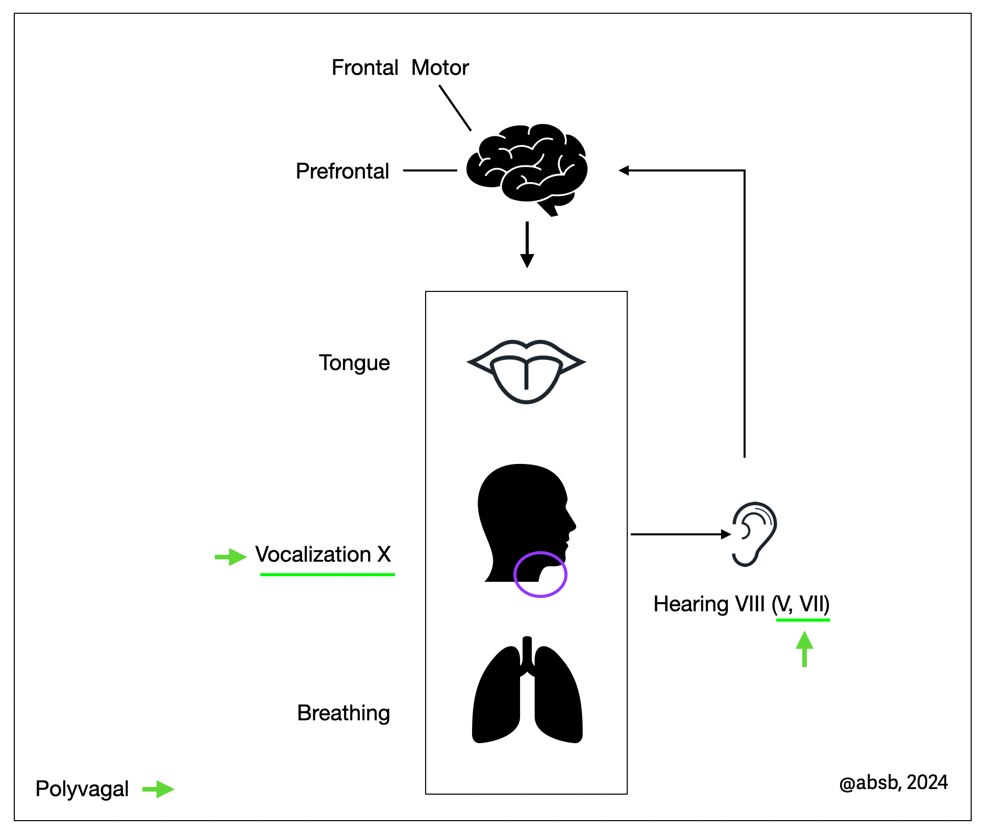 Moreover, human speech is produced not only by the VVC (branchiomotor X), but also by several organs: the respiratory muscles, the larynx (CN X), and the tongue (CN XII).