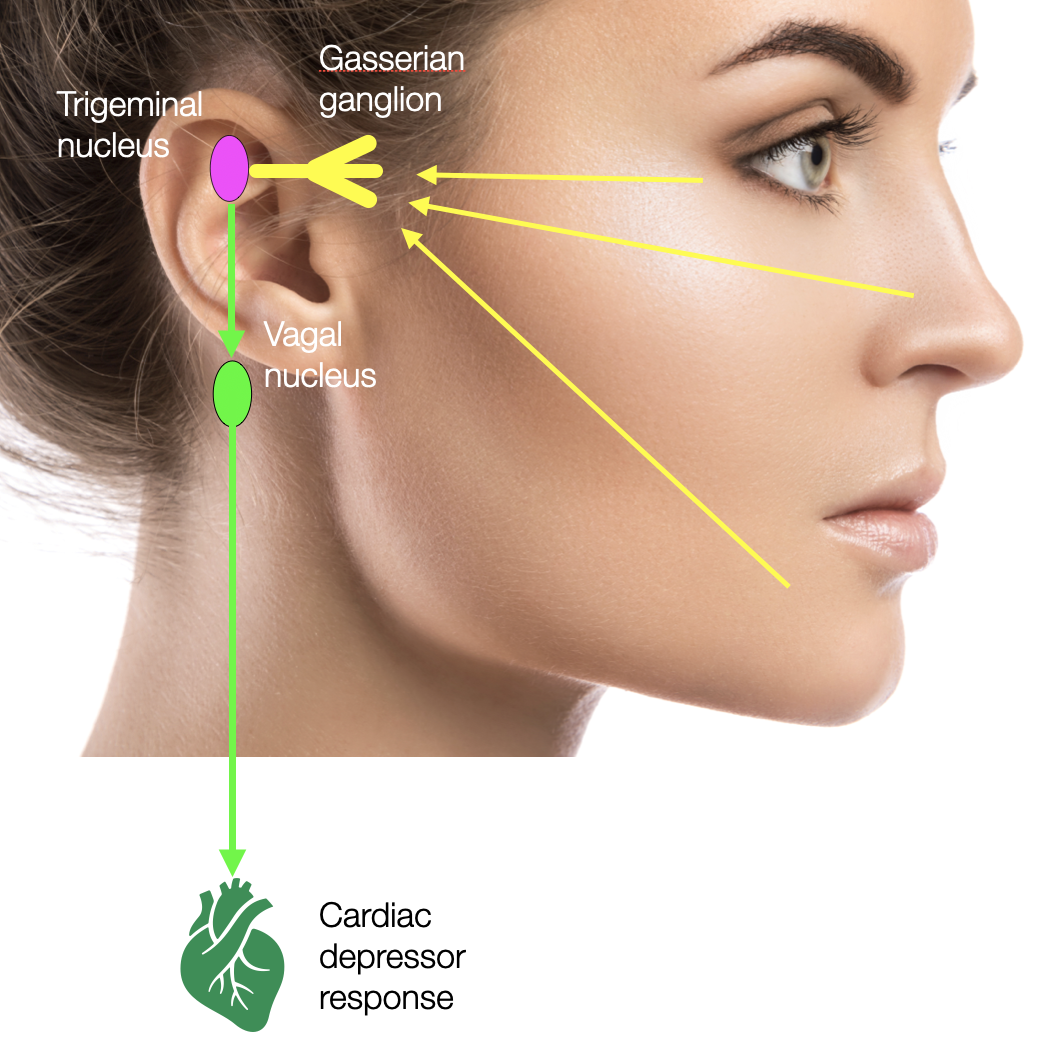 Simplified representation of the Trigeminal Reflex, triggered by a strong sensory stimulation at the face level (e.g., surgery, or cold water).