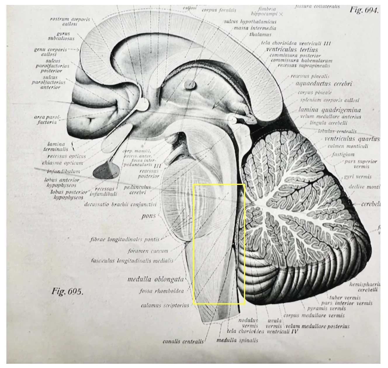 The first diagram shows the triune brain. The limbic system, the siege of emotions for MacLean, is located in a subcortical part of the frontal brain. The second diagram (background image from Sobotta, 1922) shows (yellow square) where most of the polyvagal narrative takes place.