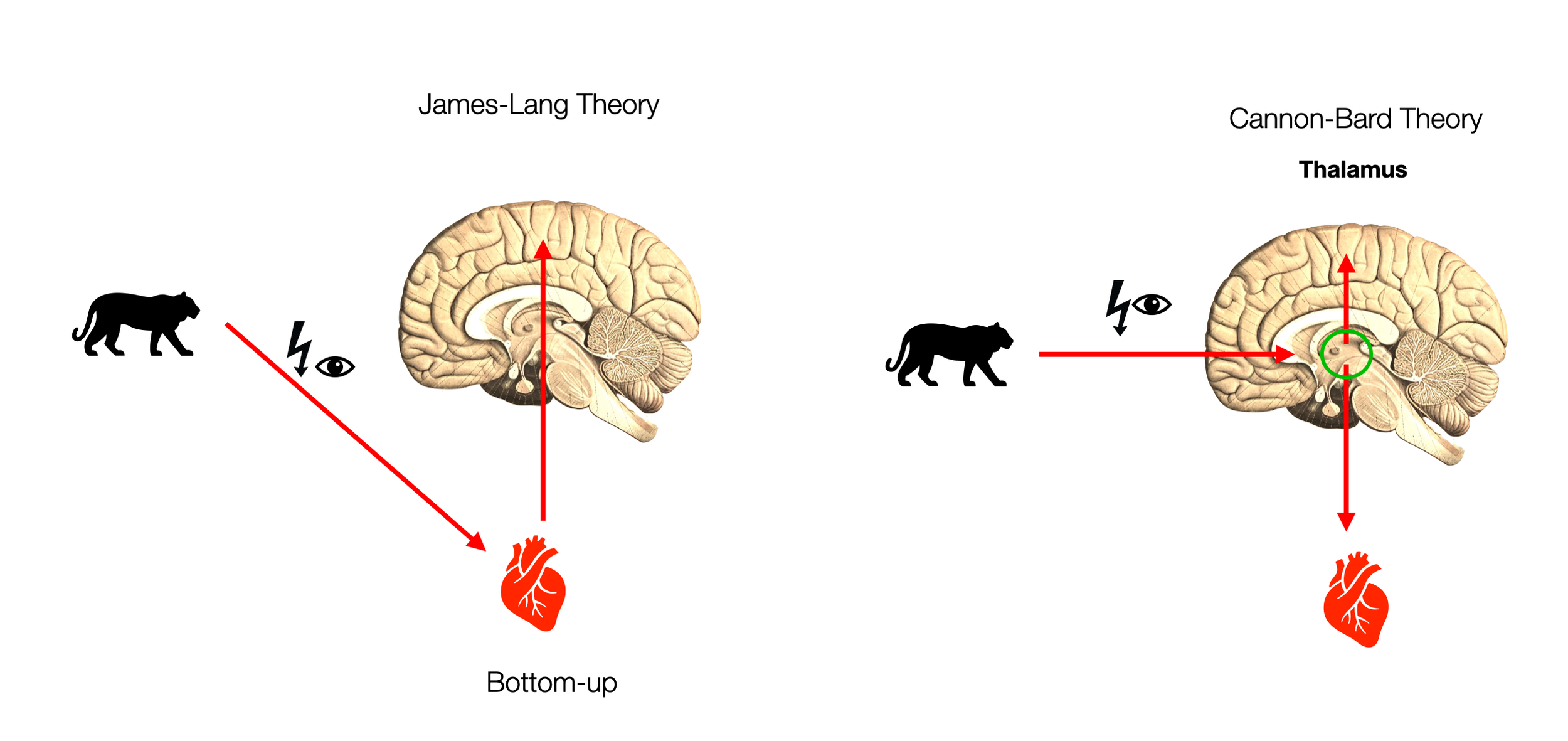 We can broadly classify the theories of emotions into two groups. In the first group, authors think emotions are born in the brain and create physical reactions (body). The second group feels that external events (e.g., confronting a tiger) trigger instant physical responses (e.g., trembling or heart palpitations), which higher centers then perceive. However, this schema is too simplistic, as the two leading theories (James-Lange and Cannon-Bard) see a double explanation (see below).